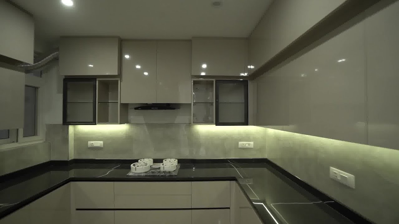 design, featuring a modular kitchen with a chimney and a hob. The property's interior boasts a thoughtfully created ambiance, with stunning false ceilings, well-planned lighting, and meticulously designed bathrooms. We have carefully